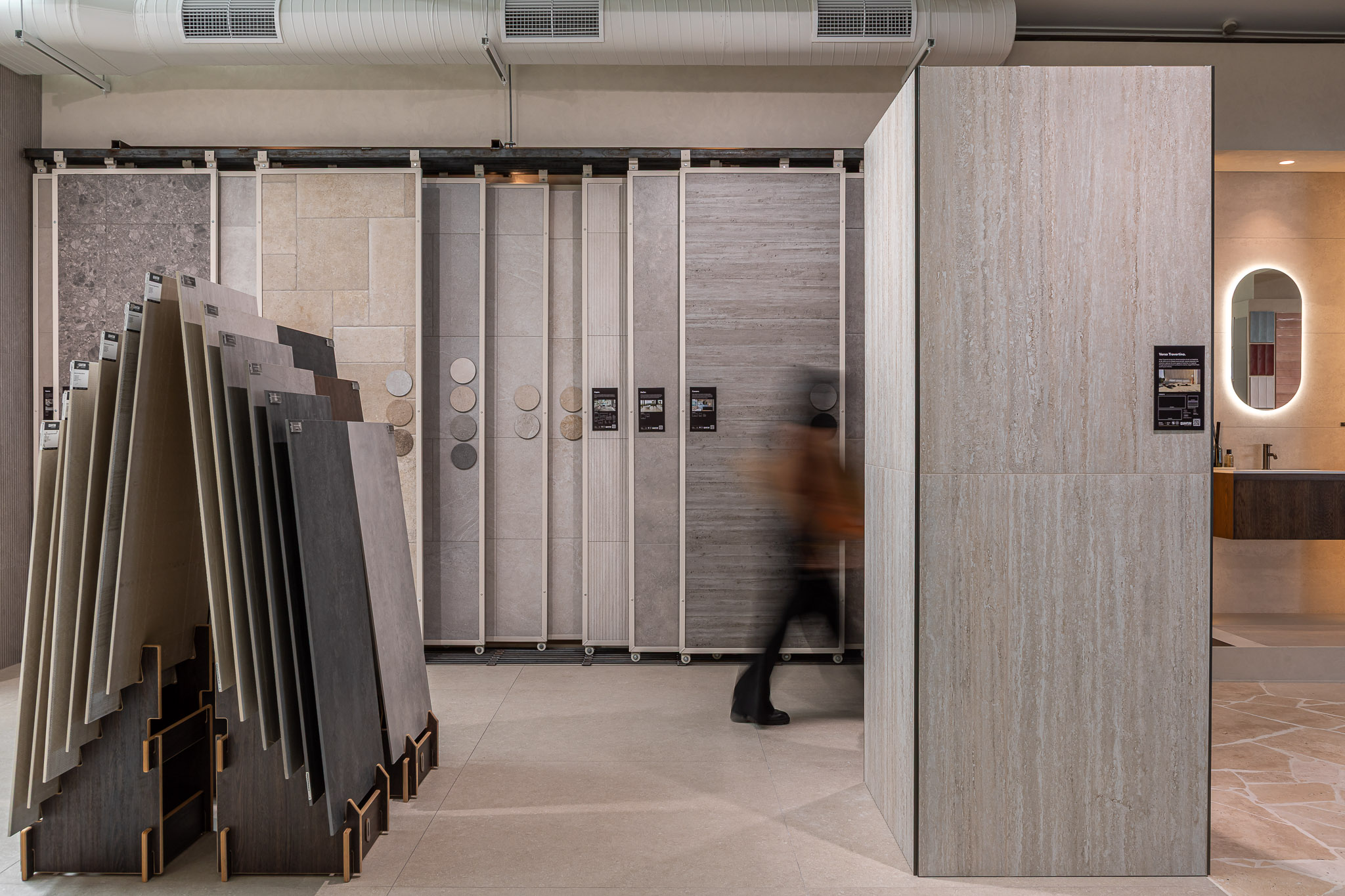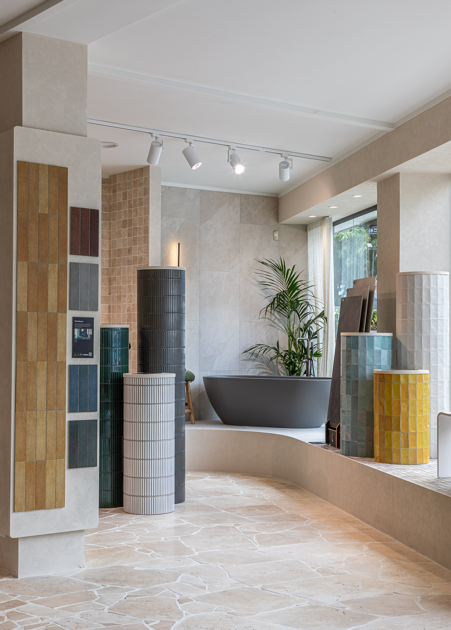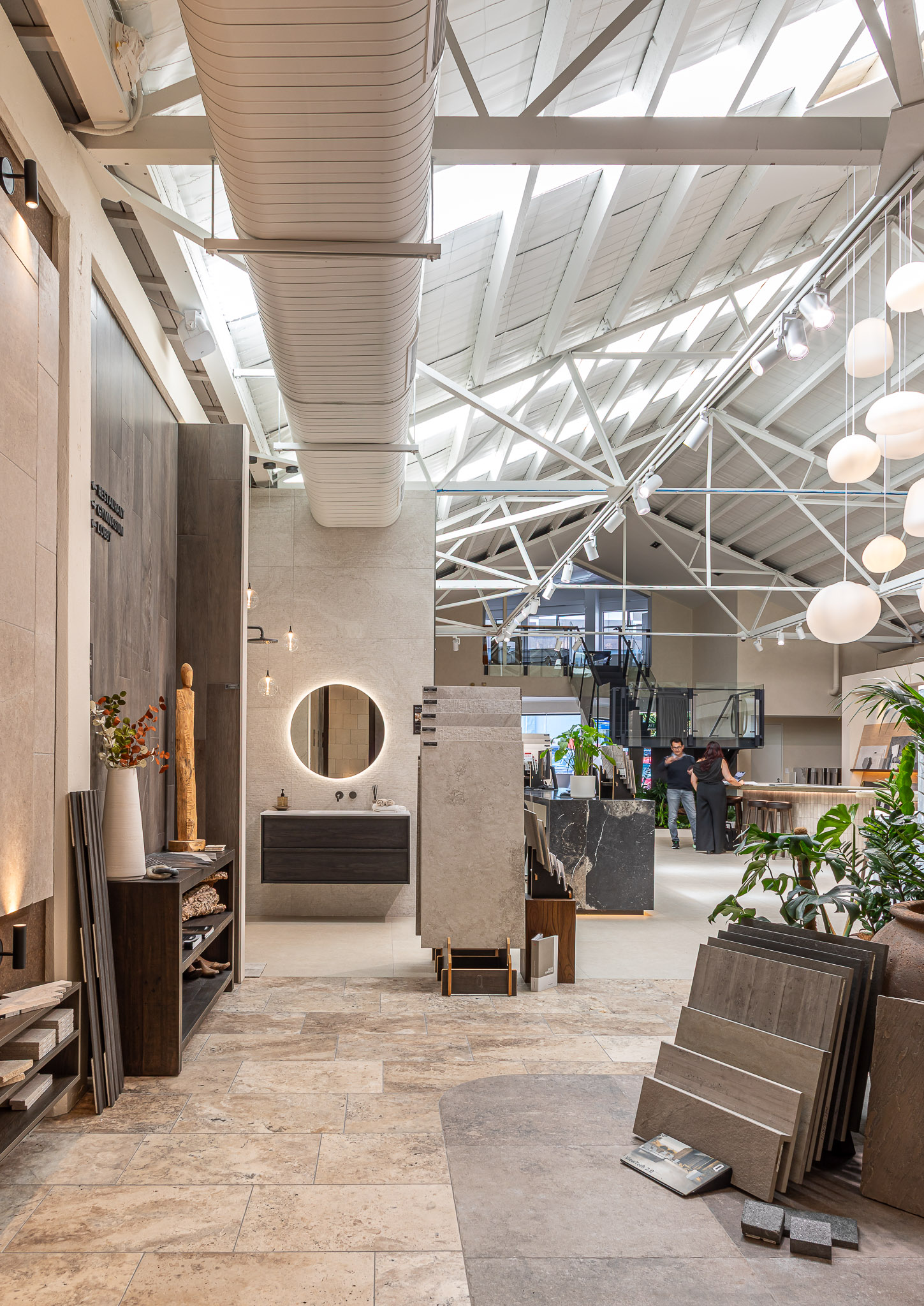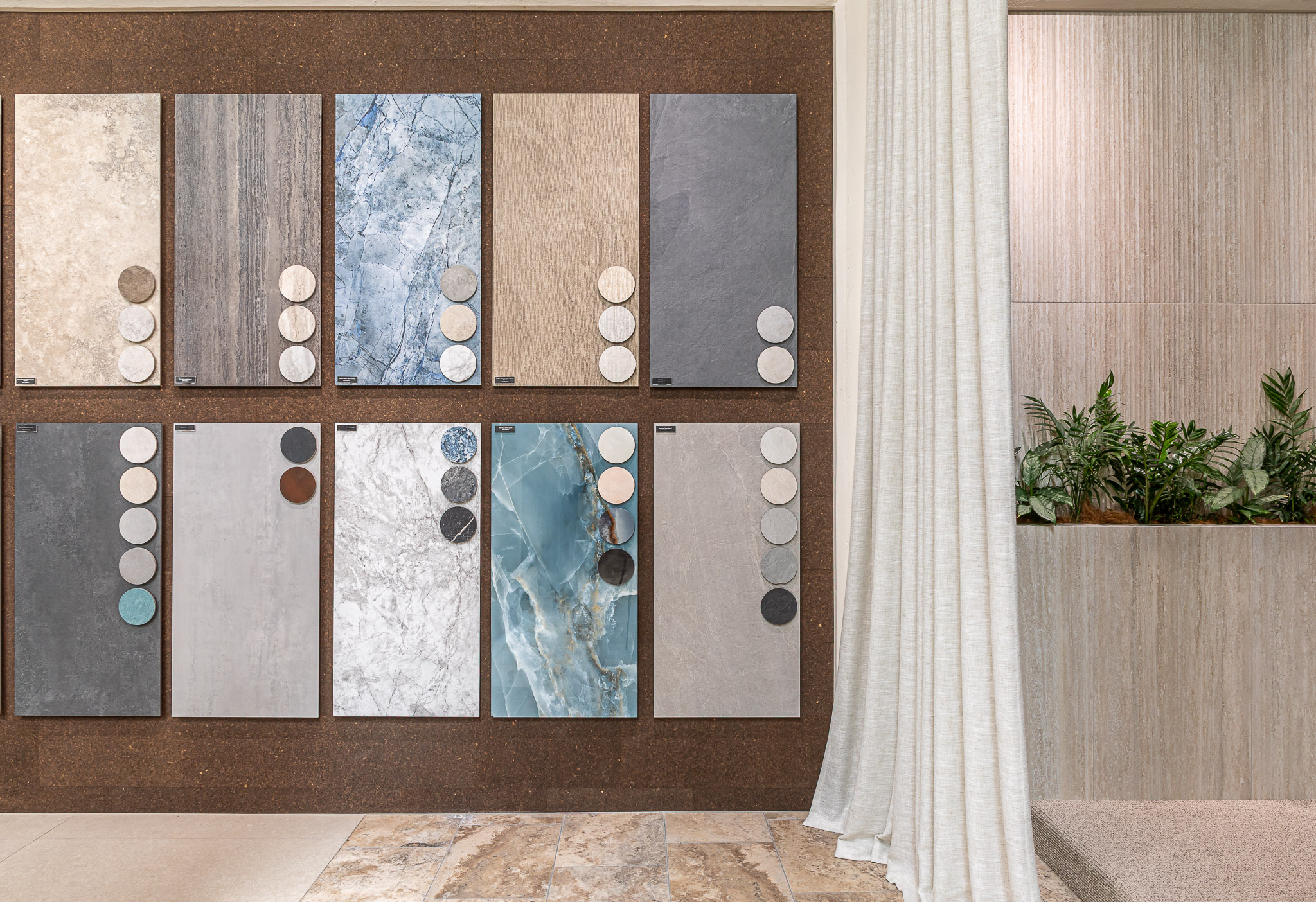 As you move through the showroom, materials shift in tone and application. Large-format stone sits alongside detailed tile work. Travertine paving connects interior and exterior zones. Moments of greenery soften the harder finishes and introduce contrast. Each area offers a different perspective, encouraging comparison and discovery.