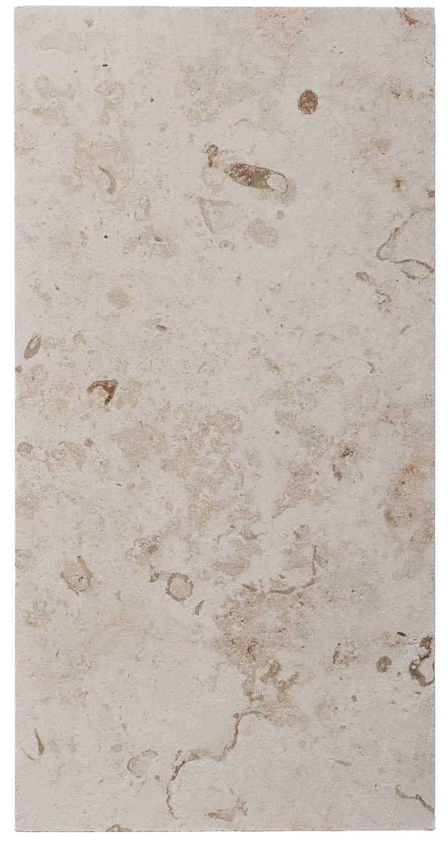 Cross-cut Jura stone is produced by cutting the block perpendicular to its natural bedding layers, rather than parallel to them. This slicing method reveals the full natural character of the limestone, including its fossil content, cloud-like patterning, tonal variations, and subtle mineral blooms. In contrast to the linear appearance of vein-cut material, cross-cut Jura displays a soft, organic, more random aesthetic, where ancient fossils and natural textures become prominent features. This is the form most commonly associated with traditional Jura limestone and is often chosen for its expressive natural beauty. Cross-cut stone generally provides good stability and a balanced appearance for tiles, slabs, and architectural components. Cross-Cut is available in all the regular surface options.