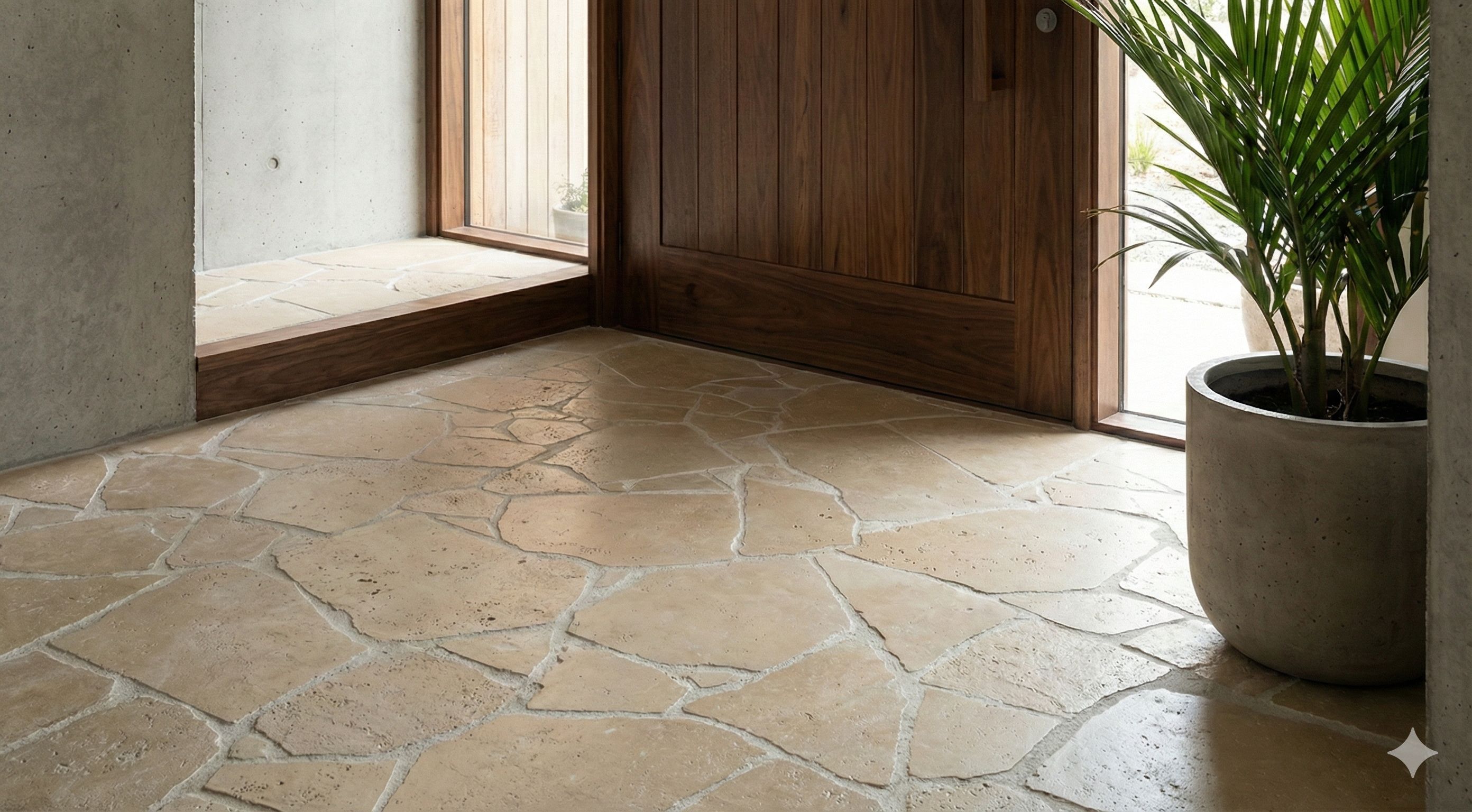 The Sparta Crazy Pave Tumbled installation style features irregular stone pieces laid randomly to ensure a unique aesthetic in every application. Whilst it sits perfectly in stylish outdoor settings, it can add real organic texture and powerful visual impact when laid throughout interior floors and walls. This material is the classic more traditional and lightly tumbled style.