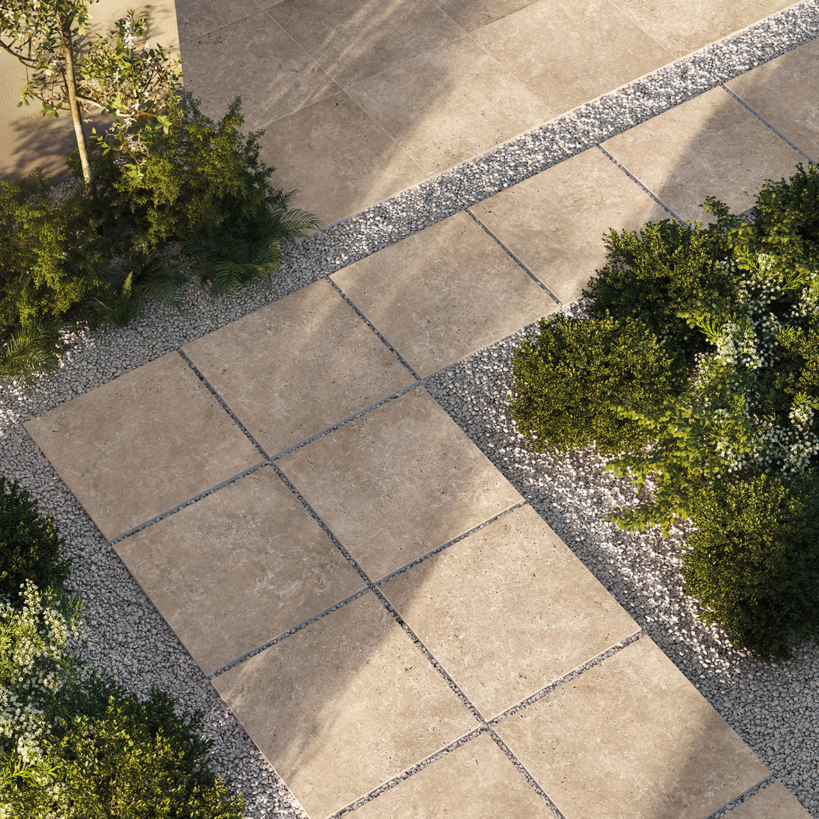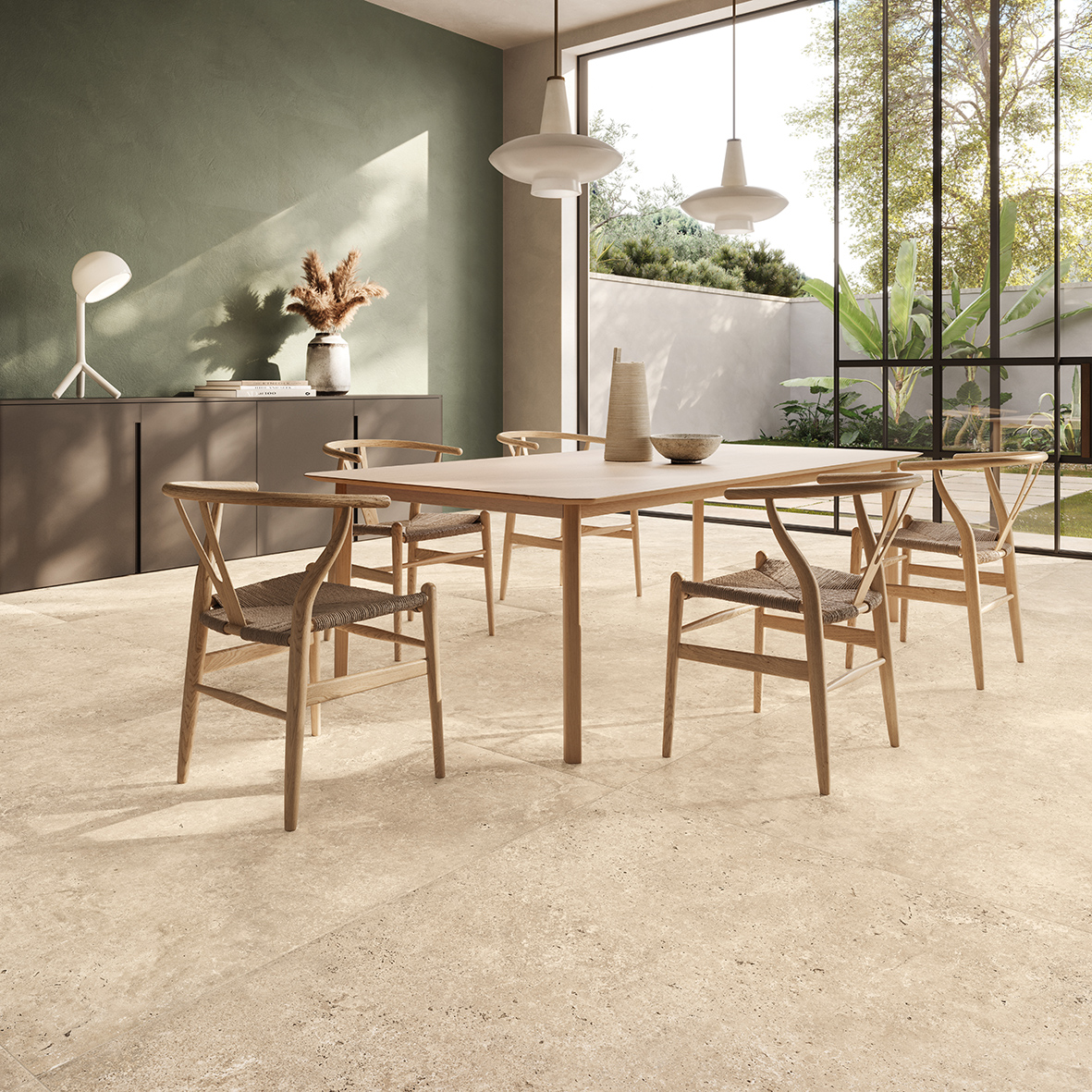 A beige porcelain stoneware tile inspired by the finest natural travertine and reinterpreted with modern taste, texture, and elegant appeal. Combining natural aesthetics with strength and practicality.