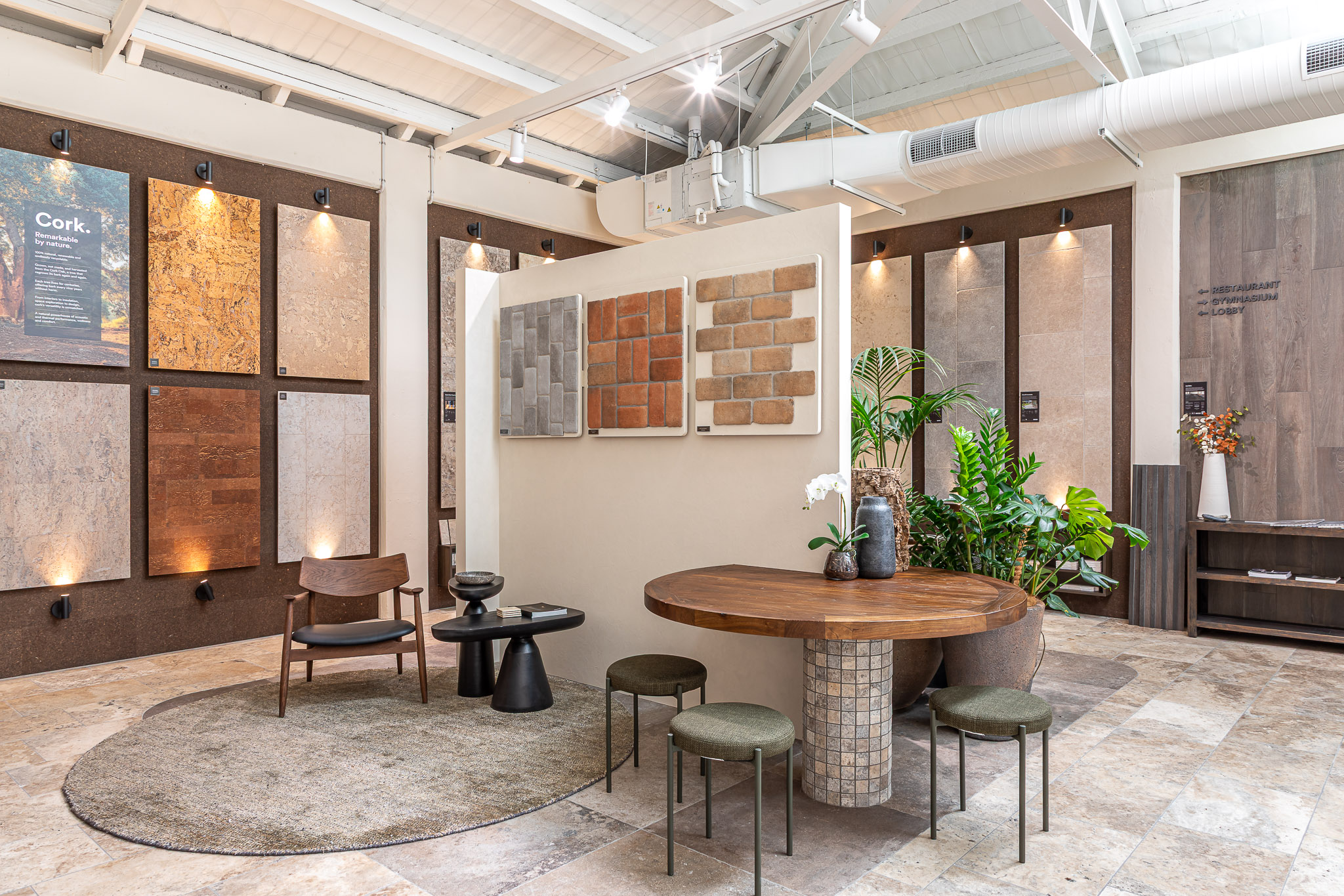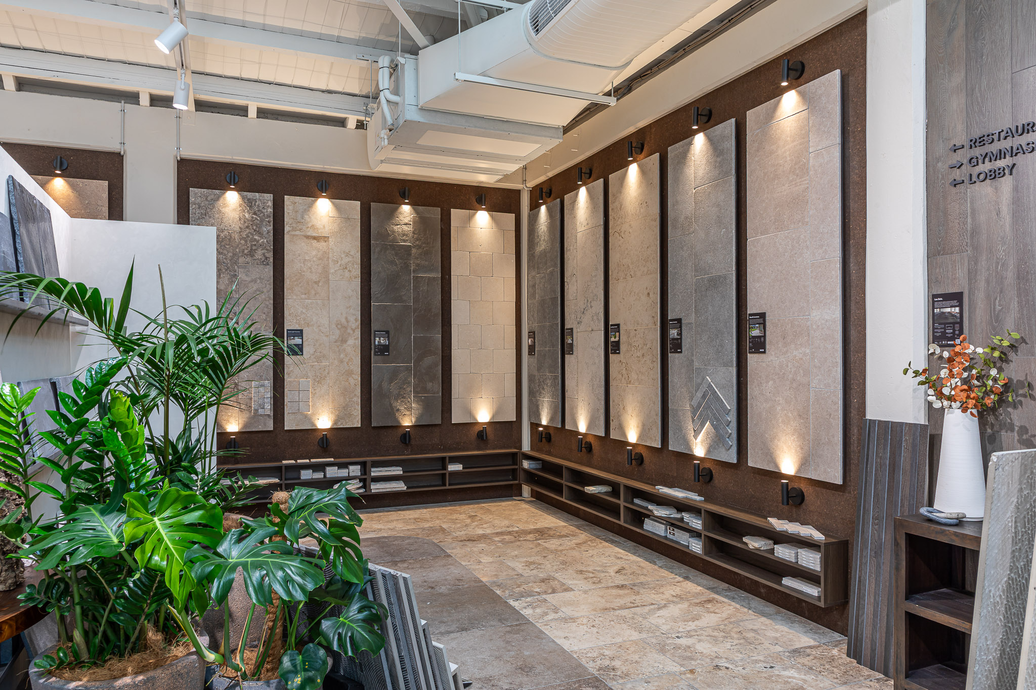 As you move through the showroom, materials shift in tone and application. Large-format stone sits alongside detailed tile work. Travertine paving connects interior and exterior zones. Moments of greenery soften the harder finishes and introduce contrast. Each area offers a different perspective, encouraging comparison and discovery.