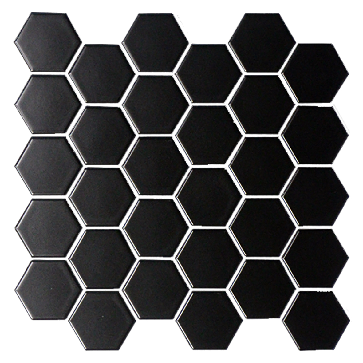 Classica Hexagon Black Matt (51mm) is a glazed hexagon porcelain mosaic in classic black. It offers endless design opportunities and can be used in both floor and wall installations.