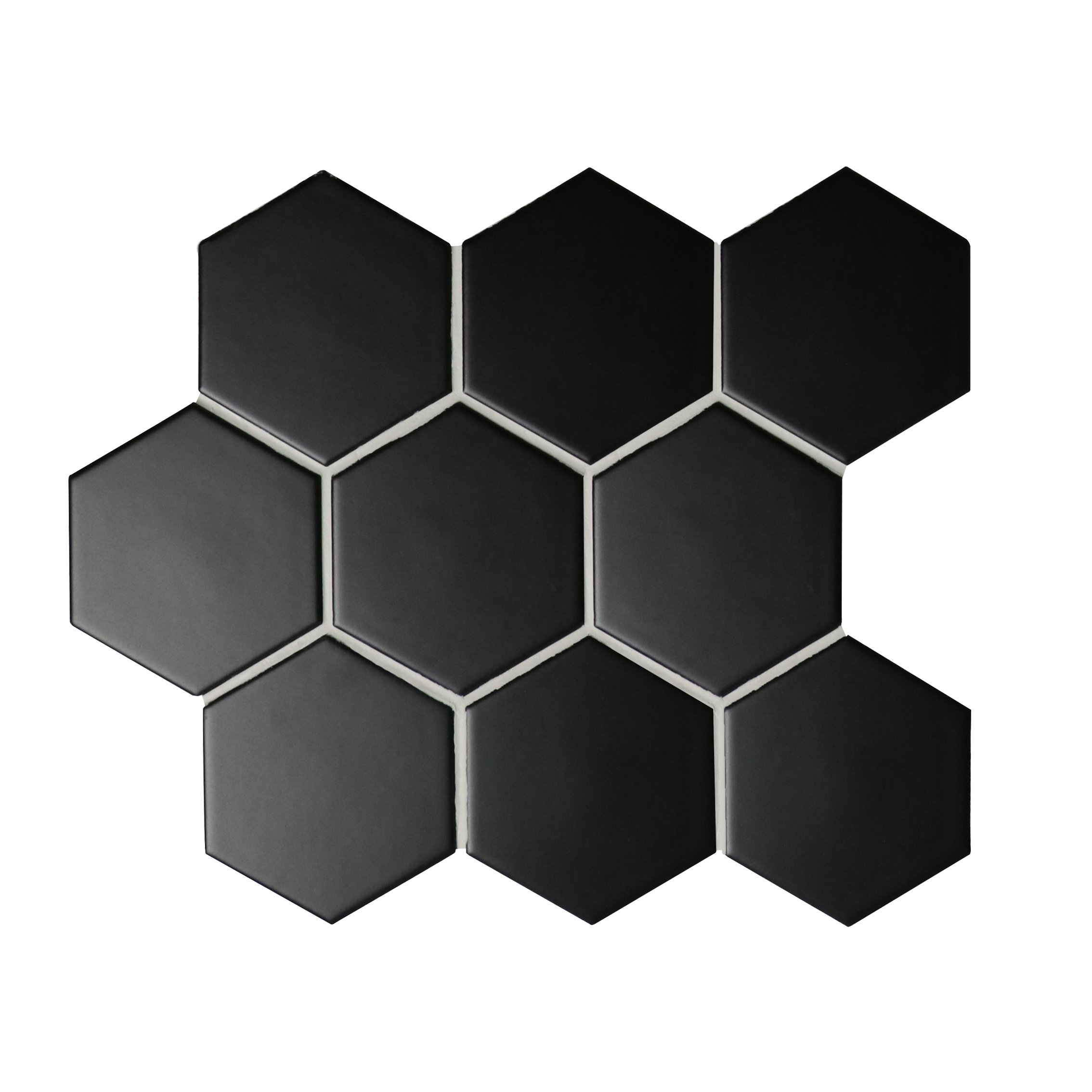 Classica Hexagon Black Matt (95mm) is a glazed hexagon porcelain mosaic in classic black. It offers endless design opportunities and can be used in both floor and wall installations.